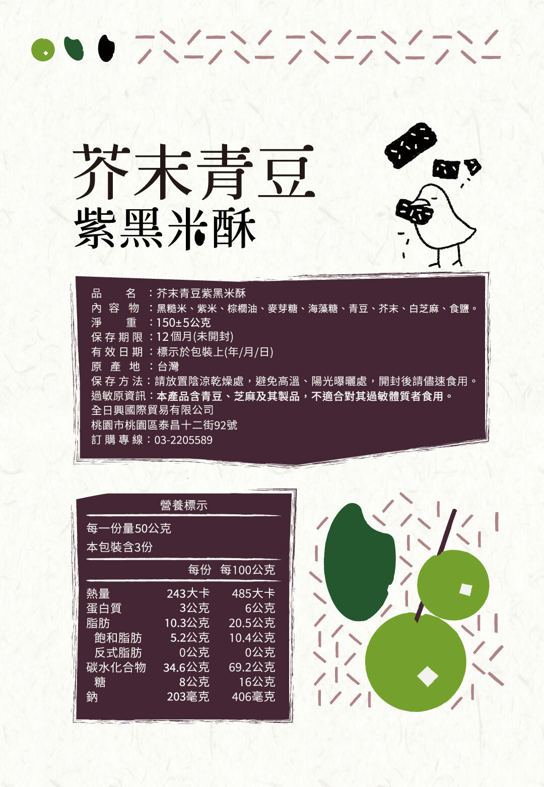 .內容物:黑米、紫米、棕梠油、麥芽糖、海藻糖、青豆、芥末、白芝麻、食鹽