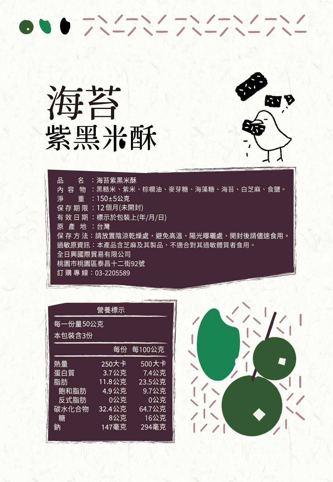 .內容物:黑米、紫米、棕梠油、麥芽糖、海藻糖、海苔、白芝麻、食鹽
