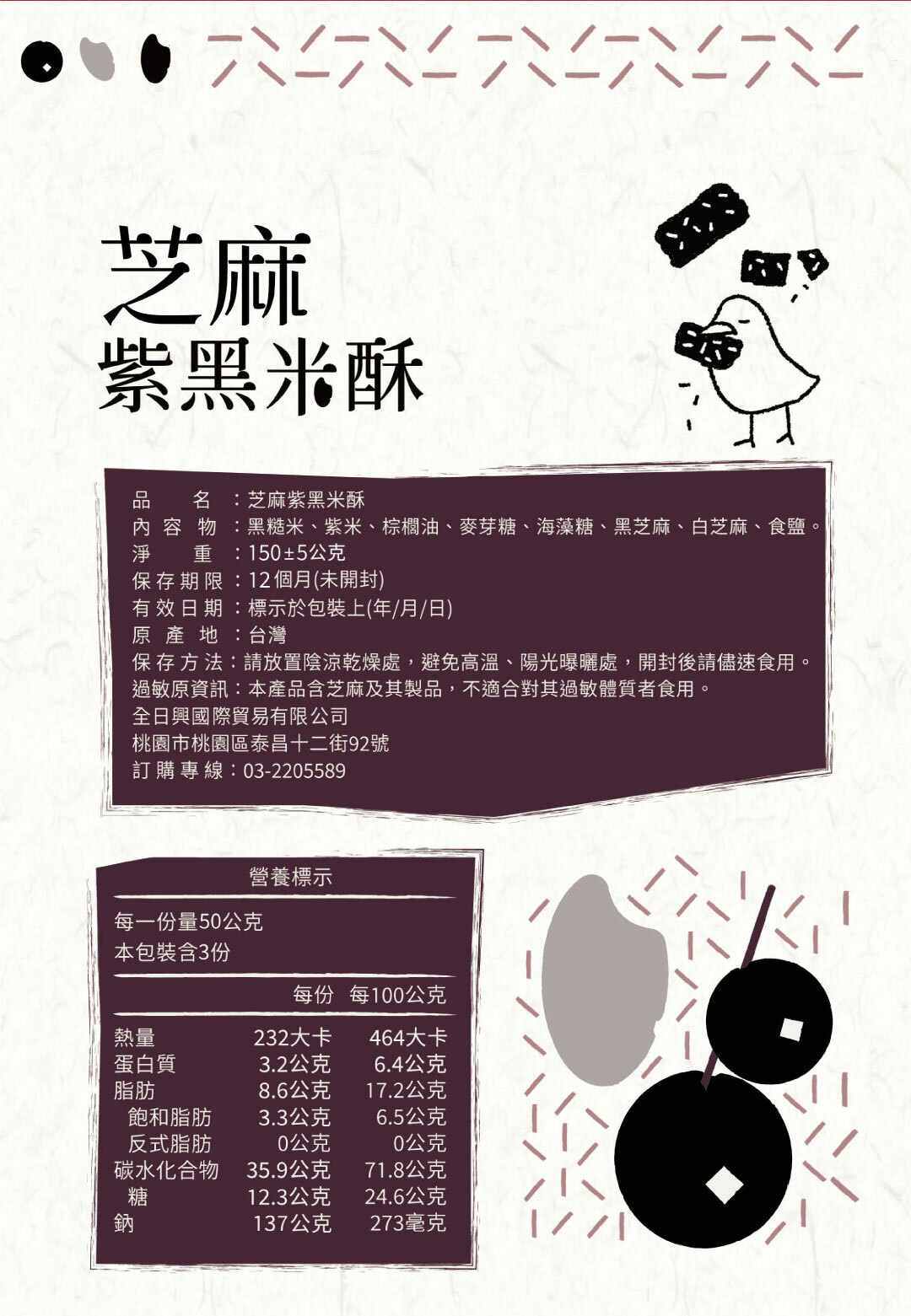 .內容物:黑米、紫米、棕梠油、麥芽糖、海藻糖、白芝麻、黑芝麻、食鹽